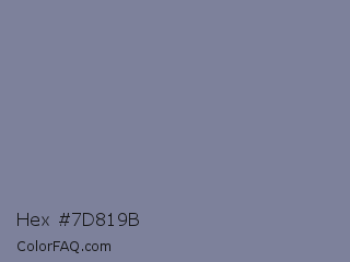 Hex #7d819b Color is a normal blue color and the nearest color is Waterloo #7b7c94. Hex code #7d819b and RGB value is rgb(125,129,155). In RGB color space, this color is composed of 49% red, 51% green, 61% blue, In CMYK color space, this color is composed of 19% cyan, 17% magenta, 0% yellow , 39% black , In HSL color space, this color has a hue angle of 232° , 13% saturation and 55% lightness.
