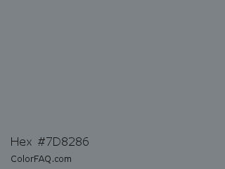 Hex #7d8286 Color is a normal blue color and the nearest color is Gunsmoke #828685. Hex code #7d8286 and RGB value is rgb(125,130,134). In RGB color space, this color is composed of 49% red, 51% green, 53% blue, In CMYK color space, this color is composed of 7% cyan, 3% magenta, 0% yellow , 47% black , In HSL color space, this color has a hue angle of 207° , 4% saturation and 51% lightness.