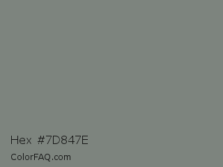 Hex #7d847e Color is a normal green color and the nearest color is Gray #808080. Hex code #7d847e and RGB value is rgb(125,132,126). In RGB color space, this color is composed of 49% red, 52% green, 49% blue, In CMYK color space, this color is composed of 5% cyan, 0% magenta, 5% yellow , 48% black , In HSL color space, this color has a hue angle of 129° , 3% saturation and 50% lightness.