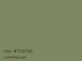 Hex #7d8760 Color is a normal lime color and the nearest color is Flax Smoke #7b8265. Hex code #7d8760 and RGB value is rgb(125,135,96). In RGB color space, this color is composed of 49% red, 53% green, 38% blue, In CMYK color space, this color is composed of 7% cyan, 0% magenta, 29% yellow , 47% black , In HSL color space, this color has a hue angle of 75° , 17% saturation and 45% lightness.