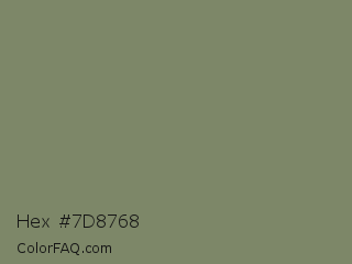 Hex #7d8768 Color is a normal lime color and the nearest color is Camouflage Green #78866b. Hex code #7d8768 and RGB value is rgb(125,135,104). In RGB color space, this color is composed of 49% red, 53% green, 41% blue, In CMYK color space, this color is composed of 7% cyan, 0% magenta, 23% yellow , 47% black , In HSL color space, this color has a hue angle of 79° , 13% saturation and 47% lightness.