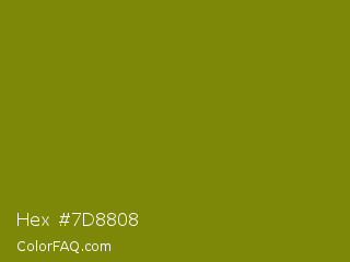 Hex #7d8808 Color is a dark yellow color and the nearest color is Olive #808000. Hex code #7d8808 and RGB value is rgb(125,136,8). In RGB color space, this color is composed of 49% red, 53% green, 3% blue, In CMYK color space, this color is composed of 8% cyan, 0% magenta, 94% yellow , 47% black , In HSL color space, this color has a hue angle of 65° , 89% saturation and 28% lightness.