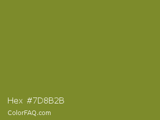 Hex #7d8b2b Color is a normal yellow color and the nearest color is Wasabi #788a25. Hex code #7d8b2b and RGB value is rgb(125,139,43). In RGB color space, this color is composed of 49% red, 55% green, 17% blue, In CMYK color space, this color is composed of 10% cyan, 0% magenta, 69% yellow , 45% black , In HSL color space, this color has a hue angle of 69° , 53% saturation and 36% lightness.