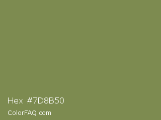 Hex #7d8b50 Color is a normal lime color and the nearest color is Clay Creek #8a8360. Hex code #7d8b50 and RGB value is rgb(125,139,80). In RGB color space, this color is composed of 49% red, 55% green, 31% blue, In CMYK color space, this color is composed of 10% cyan, 0% magenta, 42% yellow , 45% black , In HSL color space, this color has a hue angle of 74° , 27% saturation and 43% lightness.