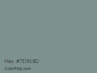 Hex #7d918d Color is a normal cyan color and the nearest color is Dolphin Gray #828e84. Hex code #7d918d and RGB value is rgb(125,145,141). In RGB color space, this color is composed of 49% red, 57% green, 55% blue, In CMYK color space, this color is composed of 14% cyan, 0% magenta, 3% yellow , 43% black , In HSL color space, this color has a hue angle of 168° , 8% saturation and 53% lightness.