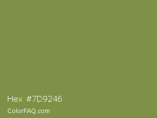 Hex #7d9246 Color is a normal lime color and the nearest color is Palm Leaf #6f9940. Hex code #7d9246 and RGB value is rgb(125,146,70). In RGB color space, this color is composed of 49% red, 57% green, 27% blue, In CMYK color space, this color is composed of 14% cyan, 0% magenta, 52% yellow , 43% black , In HSL color space, this color has a hue angle of 77° , 35% saturation and 42% lightness.