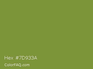 Hex #7d933a Color is a normal lime color and the nearest color is Palm Leaf #6f9940. Hex code #7d933a and RGB value is rgb(125,147,58). In RGB color space, this color is composed of 49% red, 58% green, 23% blue, In CMYK color space, this color is composed of 15% cyan, 0% magenta, 61% yellow , 42% black , In HSL color space, this color has a hue angle of 75° , 43% saturation and 40% lightness.