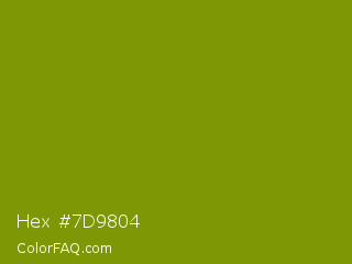 Hex #7d9804 Color is a normal lime color and the nearest color is Limeade #6f9d02. Hex code #7d9804 and RGB value is rgb(125,152,4). In RGB color space, this color is composed of 49% red, 60% green, 2% blue, In CMYK color space, this color is composed of 18% cyan, 0% magenta, 97% yellow , 40% black , In HSL color space, this color has a hue angle of 71° , 95% saturation and 31% lightness.