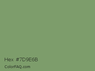 Hex #7d9e6b Color is a normal green color and the nearest color is Asparagus #87a96b. Hex code #7d9e6b and RGB value is rgb(125,158,107). In RGB color space, this color is composed of 49% red, 62% green, 42% blue, In CMYK color space, this color is composed of 21% cyan, 0% magenta, 32% yellow , 38% black , In HSL color space, this color has a hue angle of 99° , 21% saturation and 52% lightness.