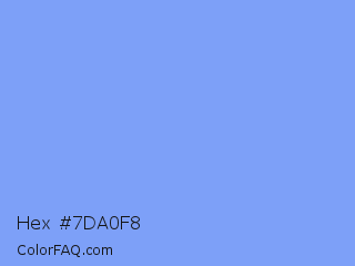Hex #7da0f8 Color is a light blue color and the nearest color is Portage #8b9fee. Hex code #7da0f8 and RGB value is rgb(125,160,248). In RGB color space, this color is composed of 49% red, 63% green, 97% blue, In CMYK color space, this color is composed of 50% cyan, 35% magenta, 0% yellow , 3% black , In HSL color space, this color has a hue angle of 223° , 90% saturation and 73% lightness.