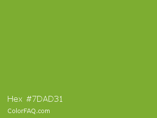 Hex #7dad31 Color is a normal green color and the nearest color is Sushi #87ab39. Hex code #7dad31 and RGB value is rgb(125,173,49). In RGB color space, this color is composed of 49% red, 68% green, 19% blue, In CMYK color space, this color is composed of 28% cyan, 0% magenta, 72% yellow , 32% black , In HSL color space, this color has a hue angle of 83° , 56% saturation and 44% lightness.