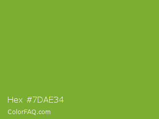 Hex #7dae34 Color is a normal green color and the nearest color is Sushi #87ab39. Hex code #7dae34 and RGB value is rgb(125,174,52). In RGB color space, this color is composed of 49% red, 68% green, 20% blue, In CMYK color space, this color is composed of 28% cyan, 0% magenta, 70% yellow , 32% black , In HSL color space, this color has a hue angle of 84° , 54% saturation and 44% lightness.
