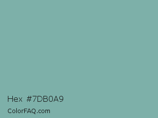 Hex #7db0a9 Color is a normal cyan color and the nearest color is Gulf Stream #80b3ae. Hex code #7db0a9 and RGB value is rgb(125,176,169). In RGB color space, this color is composed of 49% red, 69% green, 66% blue, In CMYK color space, this color is composed of 29% cyan, 0% magenta, 4% yellow , 31% black , In HSL color space, this color has a hue angle of 172° , 24% saturation and 59% lightness.