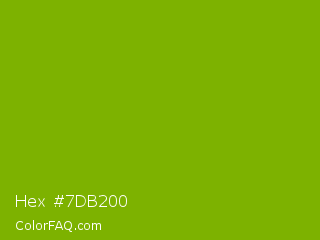 Hex #7db200 Color is a normal lime color and the nearest color is Apple Green #8db600. Hex code #7db200 and RGB value is rgb(125,178,0). In RGB color space, this color is composed of 49% red, 70% green, 0% blue, In CMYK color space, this color is composed of 30% cyan, 0% magenta, 100% yellow , 30% black , In HSL color space, this color has a hue angle of 78° , 100% saturation and 35% lightness.