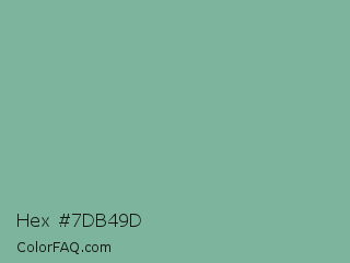 Hex #7db49d Color is a normal green color and the nearest color is Acapulco #7cb0a1. Hex code #7db49d and RGB value is rgb(125,180,157). In RGB color space, this color is composed of 49% red, 71% green, 62% blue, In CMYK color space, this color is composed of 31% cyan, 0% magenta, 13% yellow , 29% black , In HSL color space, this color has a hue angle of 155° , 27% saturation and 60% lightness.