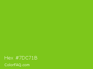 Hex #7dc71b Color is a normal green color and the nearest color is Lima #76bd17. Hex code #7dc71b and RGB value is rgb(125,199,27). In RGB color space, this color is composed of 49% red, 78% green, 11% blue, In CMYK color space, this color is composed of 37% cyan, 0% magenta, 86% yellow , 22% black , In HSL color space, this color has a hue angle of 86° , 76% saturation and 44% lightness.