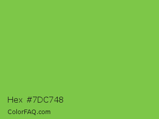 Hex #7dc748 Color is a normal green color and the nearest color is Bud Green #7bb661. Hex code #7dc748 and RGB value is rgb(125,199,72). In RGB color space, this color is composed of 49% red, 78% green, 28% blue, In CMYK color space, this color is composed of 37% cyan, 0% magenta, 64% yellow , 22% black , In HSL color space, this color has a hue angle of 95° , 53% saturation and 53% lightness.