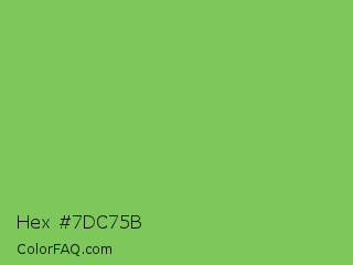 Hex #7dc75b Color is a normal green color and the nearest color is Mantis #74c365. Hex code #7dc75b and RGB value is rgb(125,199,91). In RGB color space, this color is composed of 49% red, 78% green, 36% blue, In CMYK color space, this color is composed of 37% cyan, 0% magenta, 54% yellow , 22% black , In HSL color space, this color has a hue angle of 101° , 49% saturation and 57% lightness.