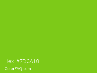 Hex #7dca18 Color is a normal green color and the nearest color is Lima #76bd17. Hex code #7dca18 and RGB value is rgb(125,202,24). In RGB color space, this color is composed of 49% red, 79% green, 9% blue, In CMYK color space, this color is composed of 38% cyan, 0% magenta, 88% yellow , 21% black , In HSL color space, this color has a hue angle of 86° , 79% saturation and 44% lightness.