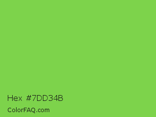 Hex #7dd34b Color is a normal green color and the nearest color is Kiwi #8ee53f. Hex code #7dd34b and RGB value is rgb(125,211,75). In RGB color space, this color is composed of 49% red, 83% green, 29% blue, In CMYK color space, this color is composed of 41% cyan, 0% magenta, 64% yellow , 17% black , In HSL color space, this color has a hue angle of 98° , 61% saturation and 56% lightness.