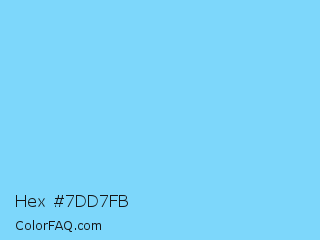 Hex #7dd7fb Color is a light blue color and the nearest color is Pale Cyan #87d3f8. Hex code #7dd7fb and RGB value is rgb(125,215,251). In RGB color space, this color is composed of 49% red, 84% green, 98% blue, In CMYK color space, this color is composed of 50% cyan, 14% magenta, 0% yellow , 2% black , In HSL color space, this color has a hue angle of 197° , 94% saturation and 74% lightness.