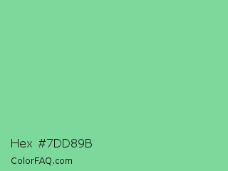 Hex #7dd89b Color is a light green color and the nearest color is De York #7ac488. Hex code #7dd89b and RGB value is rgb(125,216,155). In RGB color space, this color is composed of 49% red, 85% green, 61% blue, In CMYK color space, this color is composed of 42% cyan, 0% magenta, 28% yellow , 15% black , In HSL color space, this color has a hue angle of 140° , 54% saturation and 67% lightness.