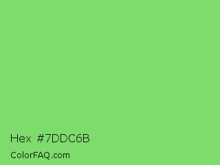Hex #7ddc6b Color is a light green color and the nearest color is Pastel Green #77dd77. Hex code #7ddc6b and RGB value is rgb(125,220,107). In RGB color space, this color is composed of 49% red, 86% green, 42% blue, In CMYK color space, this color is composed of 43% cyan, 0% magenta, 51% yellow , 14% black , In HSL color space, this color has a hue angle of 110° , 62% saturation and 64% lightness.