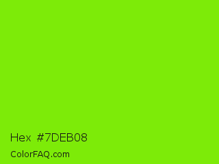 Hex #7deb08 Color is a normal green color and the nearest color is Alien Armpit #84de02. Hex code #7deb08 and RGB value is rgb(125,235,8). In RGB color space, this color is composed of 49% red, 92% green, 3% blue, In CMYK color space, this color is composed of 47% cyan, 0% magenta, 97% yellow , 8% black , In HSL color space, this color has a hue angle of 89° , 93% saturation and 48% lightness.