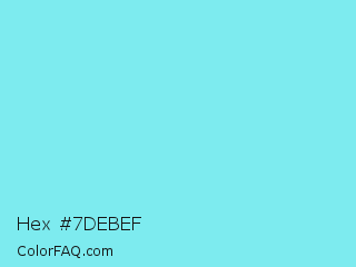 Hex #7debef Color is a light cyan color and the nearest color is Spray #79deec. Hex code #7debef and RGB value is rgb(125,235,239). In RGB color space, this color is composed of 49% red, 92% green, 94% blue, In CMYK color space, this color is composed of 48% cyan, 2% magenta, 0% yellow , 6% black , In HSL color space, this color has a hue angle of 182° , 78% saturation and 71% lightness.