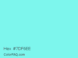 Hex #7df6ee Color is a light cyan color and the nearest color is Electric Blue #7df9ff. Hex code #7df6ee and RGB value is rgb(125,246,238). In RGB color space, this color is composed of 49% red, 96% green, 93% blue, In CMYK color space, this color is composed of 49% cyan, 0% magenta, 3% yellow , 4% black , In HSL color space, this color has a hue angle of 176° , 87% saturation and 73% lightness.