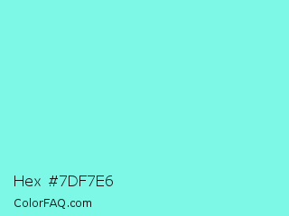 Hex #7df7e6 Color is a light cyan color and the nearest color is Aquamarine #7fffd4. Hex code #7df7e6 and RGB value is rgb(125,247,230). In RGB color space, this color is composed of 49% red, 97% green, 90% blue, In CMYK color space, this color is composed of 49% cyan, 0% magenta, 7% yellow , 3% black , In HSL color space, this color has a hue angle of 172° , 88% saturation and 73% lightness.