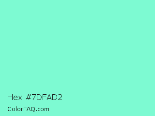 Hex #7dfad2 Color is a light green color and the nearest color is Aquamarine #7fffd4. Hex code #7dfad2 and RGB value is rgb(125,250,210). In RGB color space, this color is composed of 49% red, 98% green, 82% blue, In CMYK color space, this color is composed of 50% cyan, 0% magenta, 16% yellow , 2% black , In HSL color space, this color has a hue angle of 161° , 93% saturation and 74% lightness.