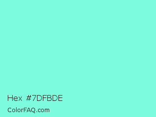 Hex #7dfbde Color is a light cyan color and the nearest color is Aquamarine #7fffd4. Hex code #7dfbde and RGB value is rgb(125,251,222). In RGB color space, this color is composed of 49% red, 98% green, 87% blue, In CMYK color space, this color is composed of 50% cyan, 0% magenta, 12% yellow , 2% black , In HSL color space, this color has a hue angle of 166° , 94% saturation and 74% lightness.