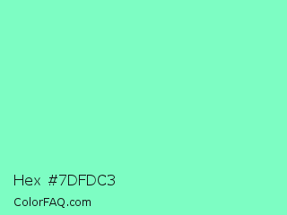 Hex #7dfdc3 Color is a light green color and the nearest color is Aquamarine #7fffd4. Hex code #7dfdc3 and RGB value is rgb(125,253,195). In RGB color space, this color is composed of 49% red, 99% green, 76% blue, In CMYK color space, this color is composed of 51% cyan, 0% magenta, 23% yellow , 1% black , In HSL color space, this color has a hue angle of 153° , 97% saturation and 74% lightness.