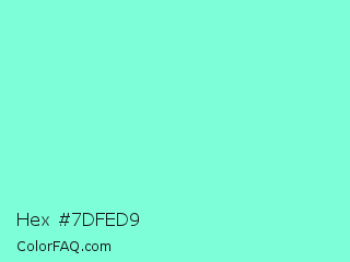 Hex #7dfed9 Color is a light green color and the nearest color is Aquamarine #7fffd4. Hex code #7dfed9 and RGB value is rgb(125,254,217). In RGB color space, this color is composed of 49% red, 100% green, 85% blue, In CMYK color space, this color is composed of 51% cyan, 0% magenta, 15% yellow , 0% black , In HSL color space, this color has a hue angle of 163° , 98% saturation and 74% lightness.