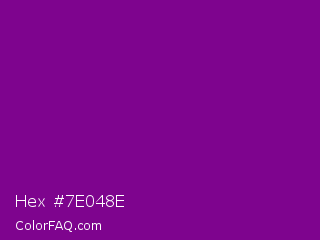Hex #7e048e Color is a dark magenta color and the nearest color is Dark Magenta #8b008b. Hex code #7e048e and RGB value is rgb(126,4,142). In RGB color space, this color is composed of 49% red, 2% green, 56% blue, In CMYK color space, this color is composed of 11% cyan, 97% magenta, 0% yellow , 44% black , In HSL color space, this color has a hue angle of 293° , 95% saturation and 29% lightness.