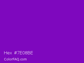 Hex #7e08be Color is a normal purple color and the nearest color is Violet RYB #8601af. Hex code #7e08be and RGB value is rgb(126,8,190). In RGB color space, this color is composed of 49% red, 3% green, 75% blue, In CMYK color space, this color is composed of 34% cyan, 96% magenta, 0% yellow , 25% black , In HSL color space, this color has a hue angle of 279° , 92% saturation and 39% lightness.