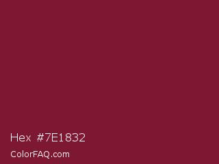 Hex #7e1832 Color is a dark red color and the nearest color is Claret #7f1734. Hex code #7e1832 and RGB value is rgb(126,24,50). In RGB color space, this color is composed of 49% red, 9% green, 20% blue, In CMYK color space, this color is composed of 0% cyan, 81% magenta, 60% yellow , 51% black , In HSL color space, this color has a hue angle of 345° , 68% saturation and 29% lightness.