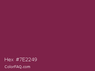 Hex #7e2249 Color is a normal rose color and the nearest color is Pansy Purple #78184a. Hex code #7e2249 and RGB value is rgb(126,34,73). In RGB color space, this color is composed of 49% red, 13% green, 29% blue, In CMYK color space, this color is composed of 0% cyan, 73% magenta, 42% yellow , 51% black , In HSL color space, this color has a hue angle of 335° , 58% saturation and 31% lightness.