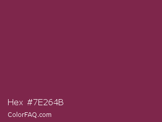 Hex #7e264b Color is a normal rose color and the nearest color is Dark Raspberry #872657. Hex code #7e264b and RGB value is rgb(126,38,75). In RGB color space, this color is composed of 49% red, 15% green, 29% blue, In CMYK color space, this color is composed of 0% cyan, 70% magenta, 40% yellow , 51% black , In HSL color space, this color has a hue angle of 335° , 54% saturation and 32% lightness.