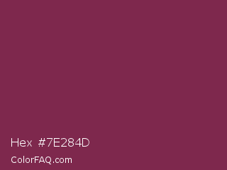 Hex #7e284d Color is a normal rose color and the nearest color is Dark Raspberry #872657. Hex code #7e284d and RGB value is rgb(126,40,77). In RGB color space, this color is composed of 49% red, 16% green, 30% blue, In CMYK color space, this color is composed of 0% cyan, 68% magenta, 39% yellow , 51% black , In HSL color space, this color has a hue angle of 334° , 52% saturation and 33% lightness.