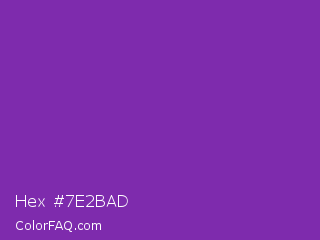 Hex #7e2bad Color is a normal purple color and the nearest color is Grape #6f2da8. Hex code #7e2bad and RGB value is rgb(126,43,173). In RGB color space, this color is composed of 49% red, 17% green, 68% blue, In CMYK color space, this color is composed of 27% cyan, 75% magenta, 0% yellow , 32% black , In HSL color space, this color has a hue angle of 278° , 60% saturation and 42% lightness.