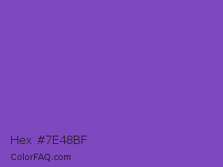 Hex #7e48bf Color is a normal violet color and the nearest color is Fuchsia Blue #7a58c1. Hex code #7e48bf and RGB value is rgb(126,72,191). In RGB color space, this color is composed of 49% red, 28% green, 75% blue, In CMYK color space, this color is composed of 34% cyan, 62% magenta, 0% yellow , 25% black , In HSL color space, this color has a hue angle of 267° , 48% saturation and 52% lightness.