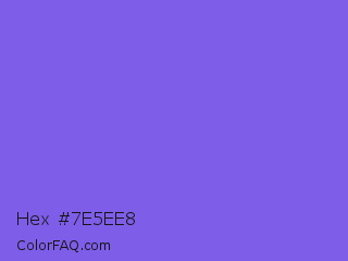 Hex #7e5ee8 Color is a light indigo color and the nearest color is Medium Slate Blue #7b68ee. Hex code #7e5ee8 and RGB value is rgb(126,94,232). In RGB color space, this color is composed of 49% red, 37% green, 91% blue, In CMYK color space, this color is composed of 46% cyan, 59% magenta, 0% yellow , 9% black , In HSL color space, this color has a hue angle of 254° , 75% saturation and 64% lightness.