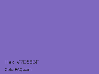 Hex #7e68bf Color is a normal indigo color and the nearest color is Blue Marguerite #7666c6. Hex code #7e68bf and RGB value is rgb(126,104,191). In RGB color space, this color is composed of 49% red, 41% green, 75% blue, In CMYK color space, this color is composed of 34% cyan, 46% magenta, 0% yellow , 25% black , In HSL color space, this color has a hue angle of 255° , 40% saturation and 58% lightness.