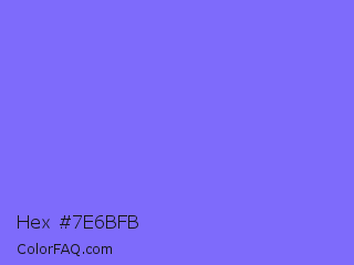 Hex #7e6bfb Color is a light indigo color and the nearest color is Medium Slate Blue #7b68ee. Hex code #7e6bfb and RGB value is rgb(126,107,251). In RGB color space, this color is composed of 49% red, 42% green, 98% blue, In CMYK color space, this color is composed of 50% cyan, 57% magenta, 0% yellow , 2% black , In HSL color space, this color has a hue angle of 248° , 95% saturation and 70% lightness.