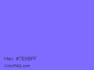 Hex #7e6bff Color is a light indigo color and the nearest color is Medium Slate Blue #7b68ee. Hex code #7e6bff and RGB value is rgb(126,107,255). In RGB color space, this color is composed of 49% red, 42% green, 100% blue, In CMYK color space, this color is composed of 51% cyan, 58% magenta, 0% yellow , 0% black , In HSL color space, this color has a hue angle of 248° , 100% saturation and 71% lightness.