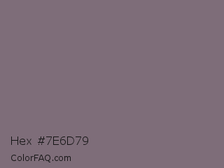 Hex #7e6d79 Color is a normal magenta color and the nearest color is Fedora #796a78. Hex code #7e6d79 and RGB value is rgb(126,109,121). In RGB color space, this color is composed of 49% red, 43% green, 47% blue, In CMYK color space, this color is composed of 0% cyan, 13% magenta, 4% yellow , 51% black , In HSL color space, this color has a hue angle of 318° , 7% saturation and 46% lightness.
