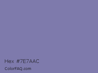 Hex #7e7aac Color is a normal indigo color and the nearest color is Wild Blue Yonder #7a89b8. Hex code #7e7aac and RGB value is rgb(126,122,172). In RGB color space, this color is composed of 49% red, 48% green, 67% blue, In CMYK color space, this color is composed of 27% cyan, 29% magenta, 0% yellow , 33% black , In HSL color space, this color has a hue angle of 245° , 23% saturation and 58% lightness.