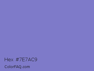 Hex #7e7ac9 Color is a light indigo color and the nearest color is Moody Blue #7f76d3. Hex code #7e7ac9 and RGB value is rgb(126,122,201). In RGB color space, this color is composed of 49% red, 48% green, 79% blue, In CMYK color space, this color is composed of 37% cyan, 39% magenta, 0% yellow , 21% black , In HSL color space, this color has a hue angle of 243° , 42% saturation and 63% lightness.